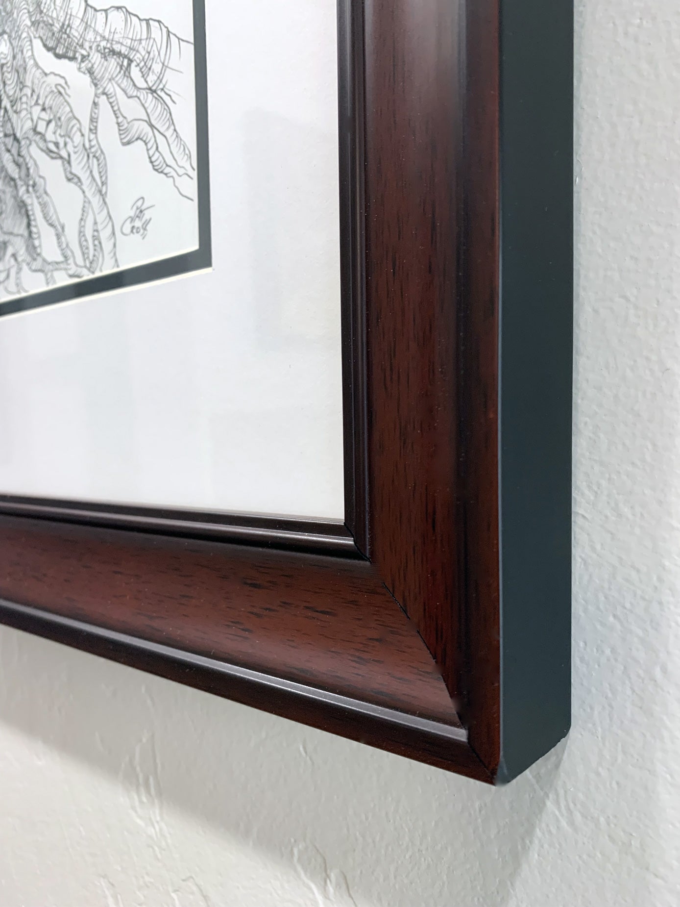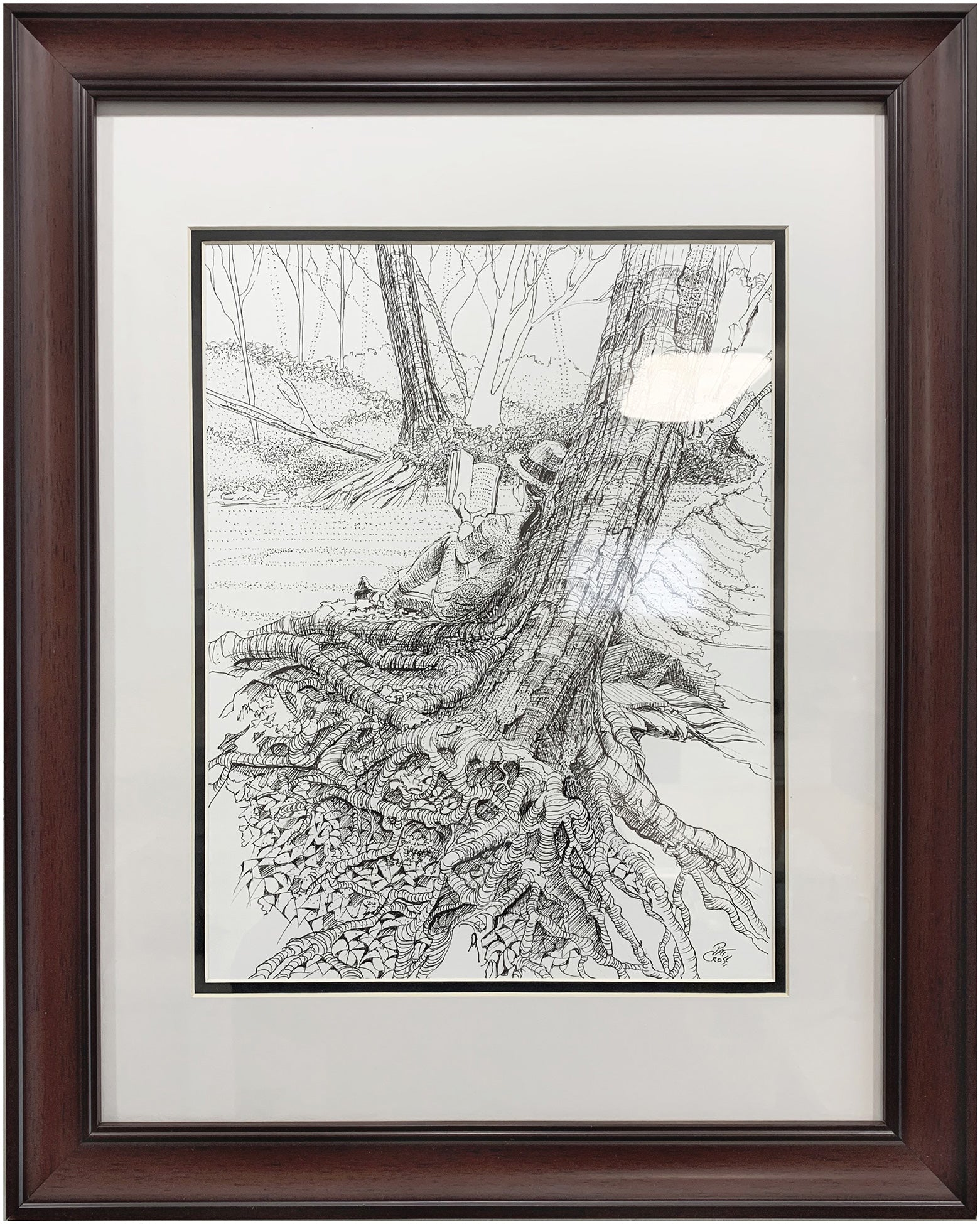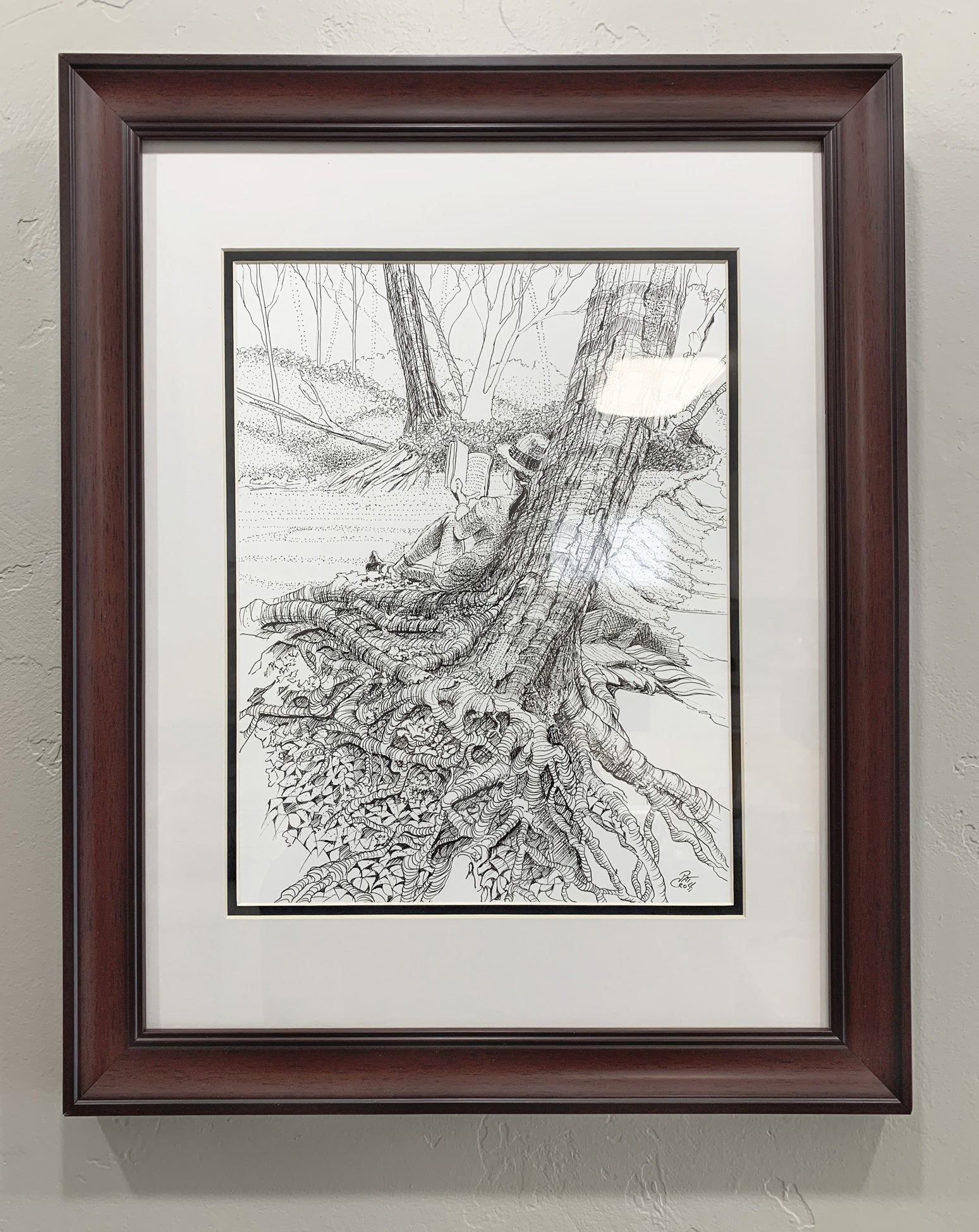 This original, Back to Her Roots, is drawn with archival quality, permanent India ink on acid-free Strathmore Bristol board for lasting impressions. The drawing is mounted in an acid-free, white matt with a black liner that sets off the crisp clarity of the black ink drawing. This drawing is mounted in an acid-free, white matt with a black liner that sets off the crisp clarity of the black ink drawing. The matted artwork is mounted into a satin black 16” x 20” frame, wired and ready to hang in your home or office.